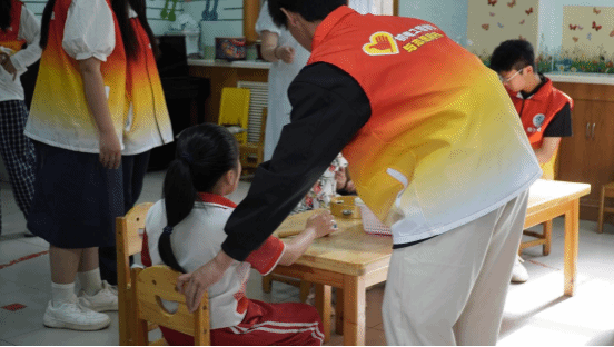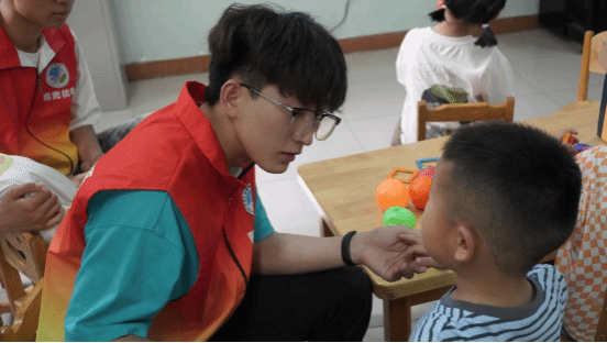 活动现场,身着红色马甲的志愿者们,化身“爱心使者”与孩子们展开一对一暖心互动。面对沟通障碍的挑战,志愿者们虚心向医护人员学习,以极大的耐心和专业的陪伴技巧,通过玩具互动、绘画交流、音乐游戏等方式,逐步打开孩子们的心扉。在志愿者们的悉心陪伴下,孩子们从最初的紧张拘谨到逐渐展露笑颜,活动现场洋溢着温馨的氛围。此次活动不仅是一次志愿服务,更是一堂生动的生命教育课。参与活动的志愿者们表示:通过近距离接触孤独症儿童,同学们不仅培养了爱心、耐心和责任心,更深刻理解了社会责任的内涵,实现了专业知识与人文素养的双重提升。